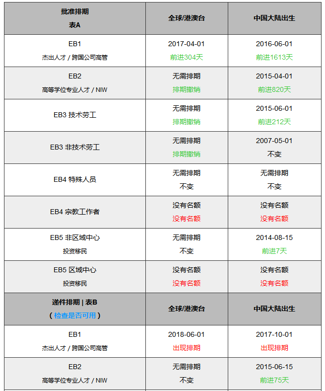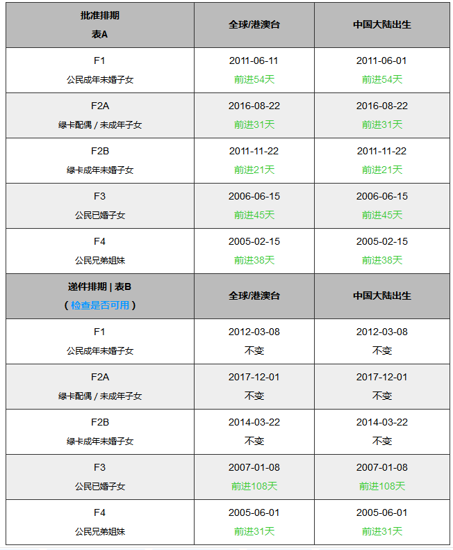 批準(zhǔn)排期(Application Final Action Dates):指有簽證名額的排期,也稱表 A。
